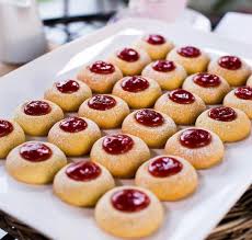 Step 2 Use lightly floured hands to roll teaspoonfuls of mixture into balls. Place on the prepared trays, about 5 cm apart. Use a lightly floured finger to make an indentation in the center of each ball. Spoon 1/2 teaspoon of jam into the center of each biscuit.